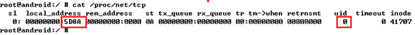其中5D8A转化成十进制就是23946,而看到uid是0,因为我们运行android_server是root身份的,uid肯定是0了。所以我们可以利用端口检查方式来进行反调试策略,当然这种方式不是万能的,后面会详细介绍如何解决这样的反调试方法。